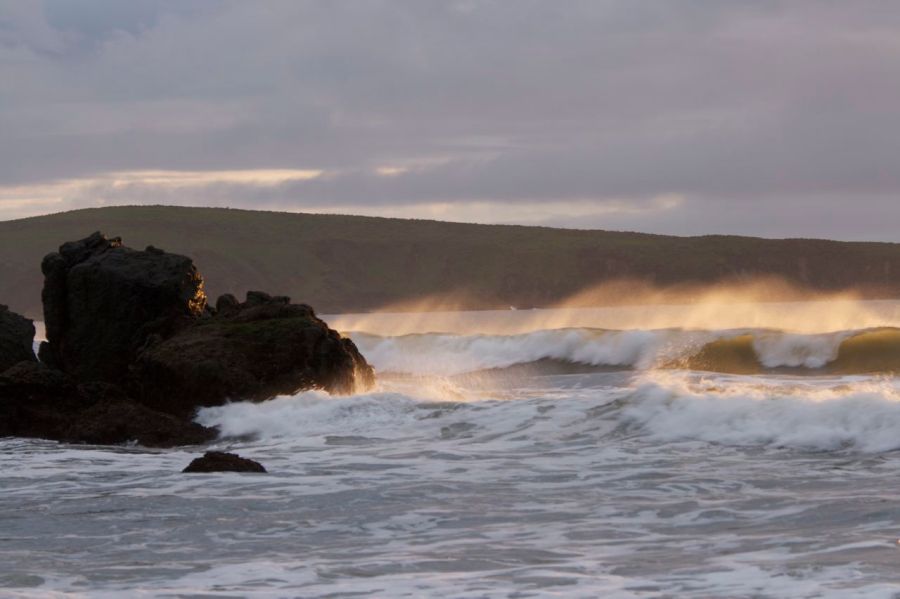 I went walking on the beach during a brief lull in a storm. As I was walking a small shaft of sunlight slid from the clouds to back light these waves. Breaks in storms equal dramatic light and clouds