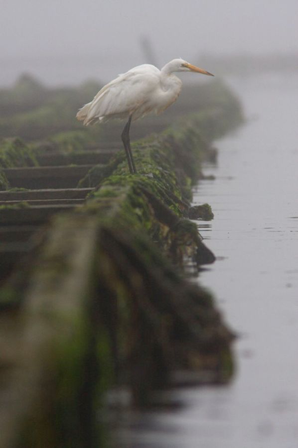 The fog gives a quietness and mystery while providing an even lighting for high detail without overblown highlights. In sunlight there would be to great of an exposure range between the egret and the dark wood