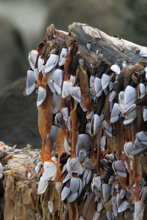 Barnacles hanging from a log at low tide