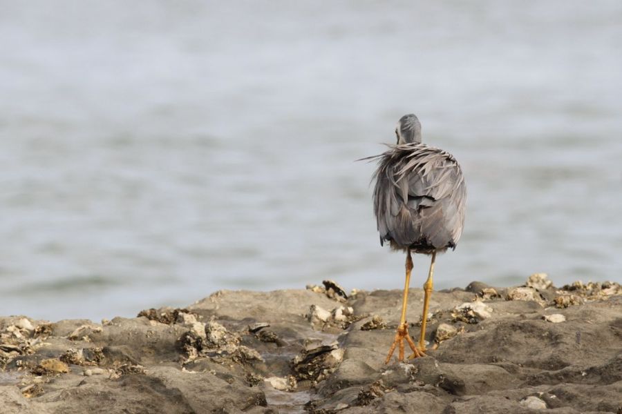 The White-faced Heron was fishing by walking the many boulders strewn along the beach, hopping from one to the next