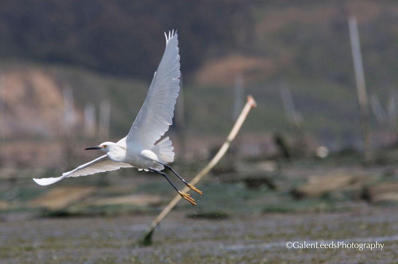 A snowy egret taking wing from the oyster fields at Tom’s Point, Tomales Bay