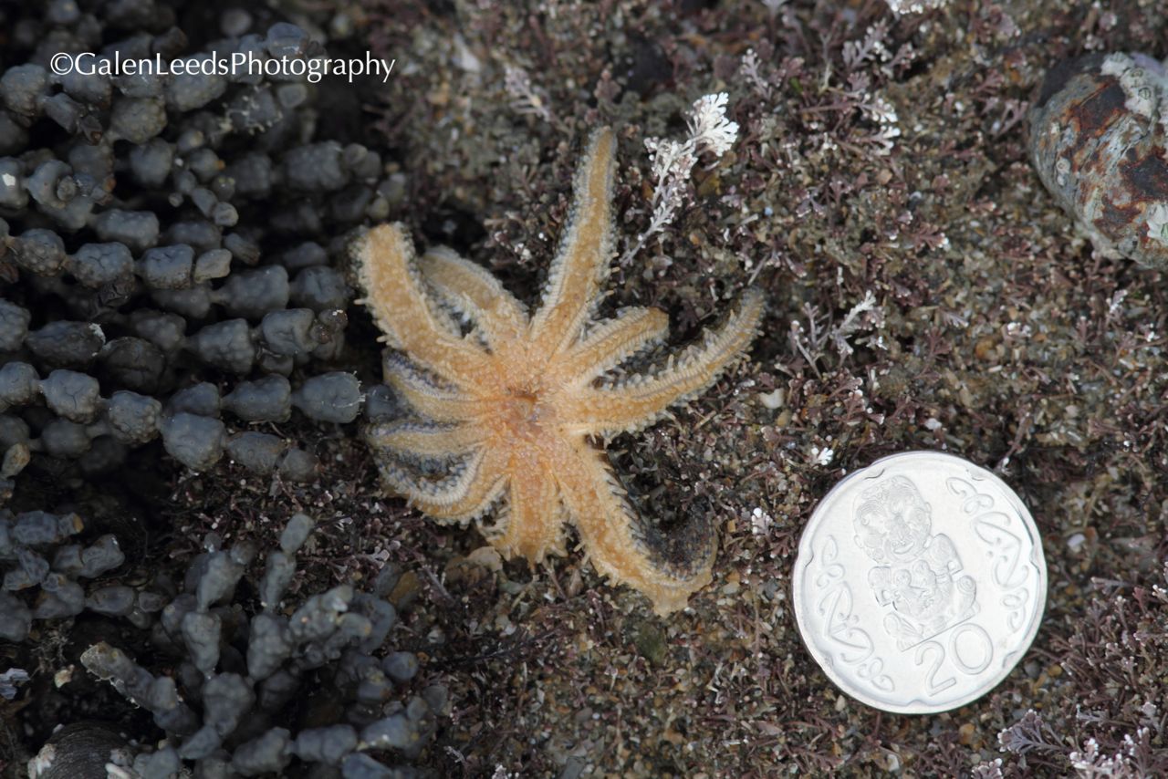 This New Zealand 20 cent piece helps give a sense of how small this star fish is, especially when compared to the larger starfish
