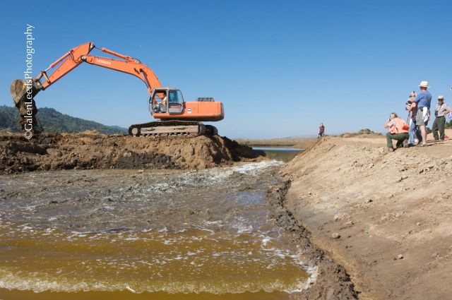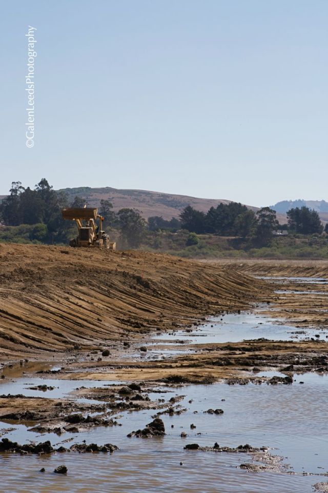 All of the work began to close in on October 25, 2008- the date when they would breach the levies for the last time and allow the tidal waters of the bay back into these lands (They couldn’t breach the levies until the earth removal was complete, or else the machines would have to work in the water and mud at low tides.) I was able to be there on that day to take photographs for the local paper. It was a beautiful thing to see, even if the instrument of the final breach was an eye jerking orange…