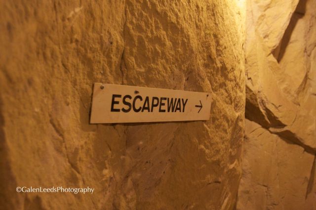 Rails run along the floor for the carts that once carried the sand to daylight, while the sandstone ceilings show the marks of ancient water drops. Vast caverns and stopes open up, supported by thick timbers and patterned columns of sand, left in place to provide structure. The feel is of a different world and a different time. The signs on the walls are almost in another language—”Escapeway” has replaced “Exit.”