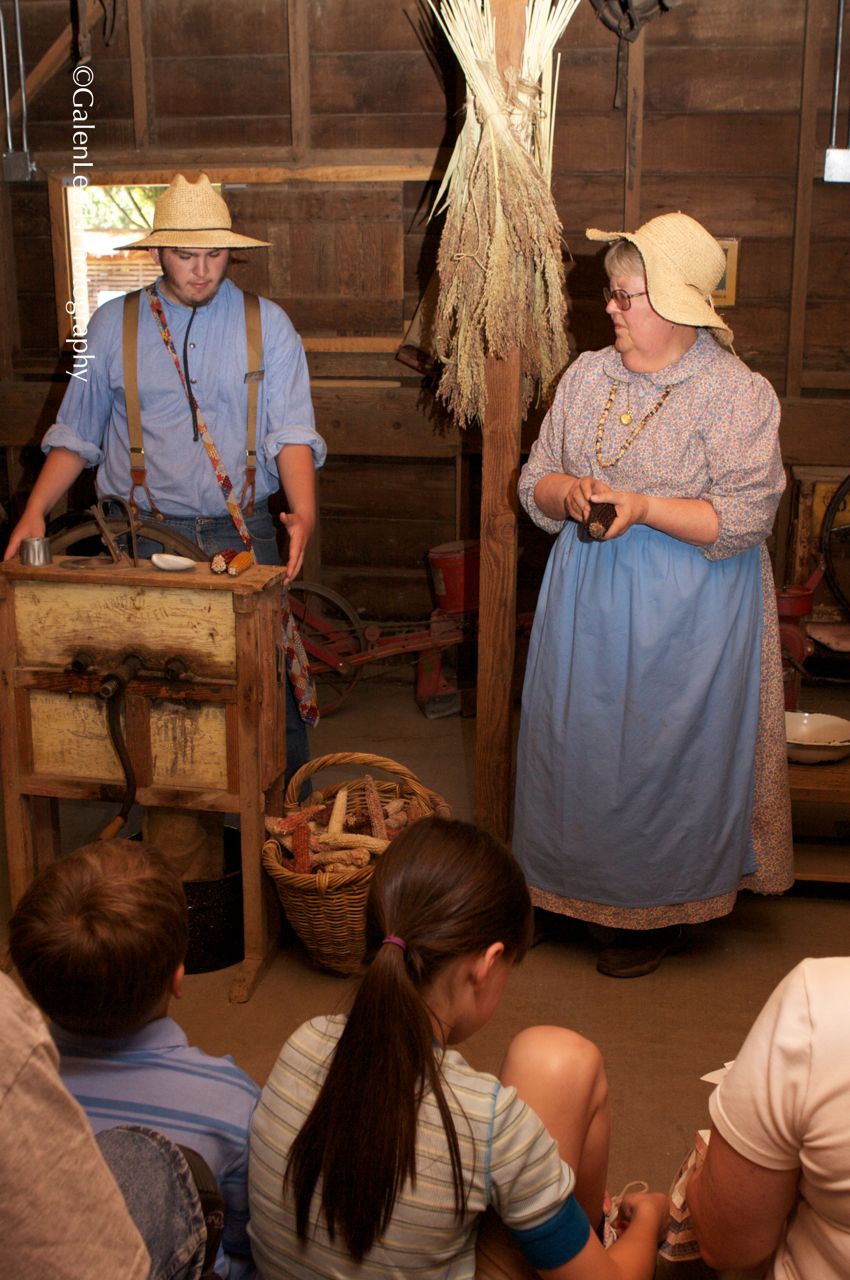 People dressed in period costume show how the tools of the time were used to separate the horn from the cob,. This is followed by the kids being allowed to feed the kernels to the chickens