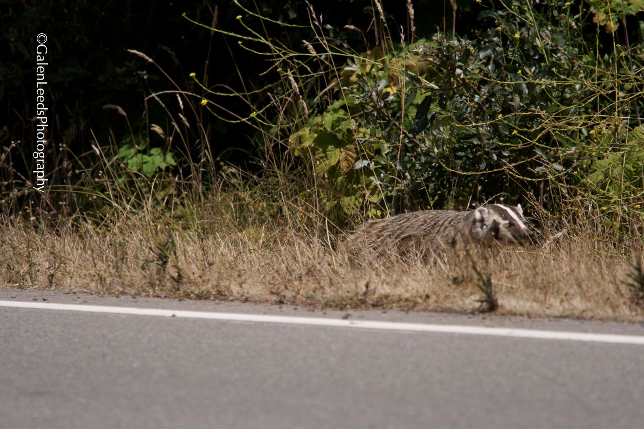 The badger, safely on the there side of the road, moments before it disappeared into the deep brush