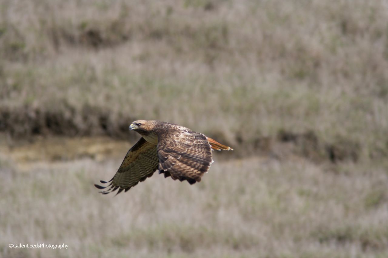 Red-tailed Hawk flying through the grassy hills of Marin