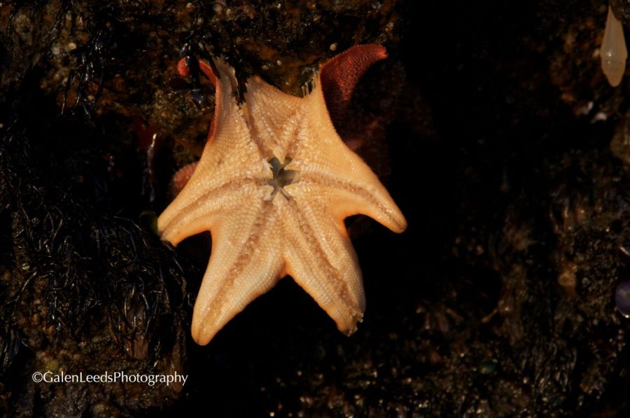 A starfish peeling from the rock face it was stuck to, as its own weight is too much at low tide