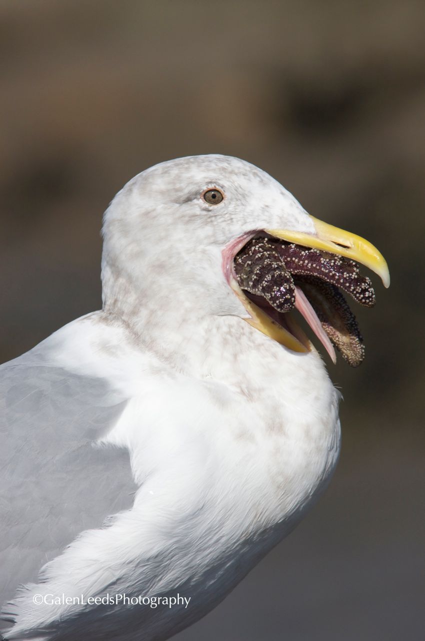 The gull seems to even be having trouble keeping its own tongue in its mouth, much less downing the starfish