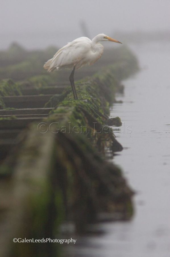 Great Egret perched upon the oyster racks of the Drake’s Bay Oyster Company, Drake’s Estero, Ca