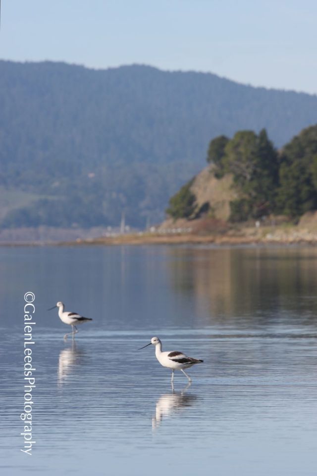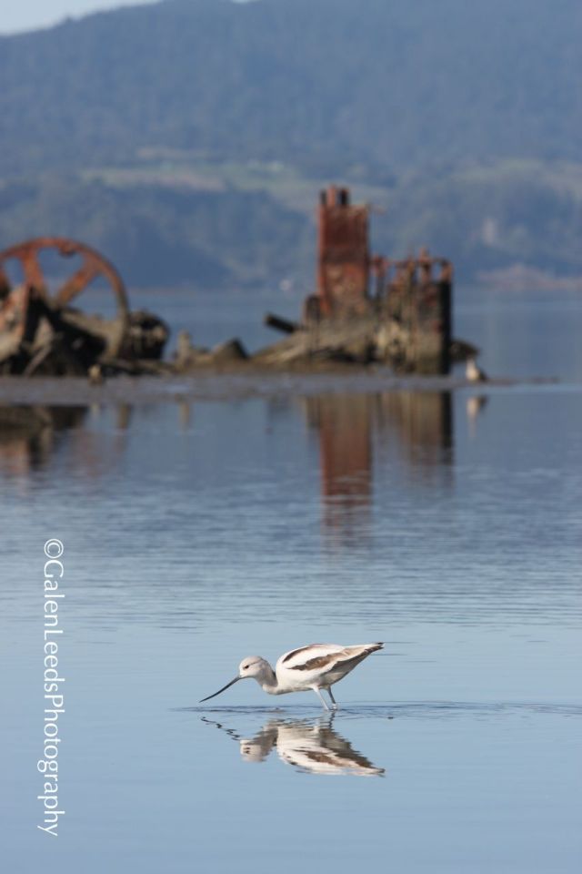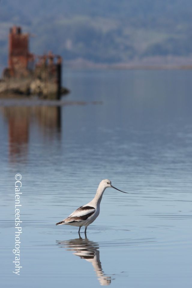 The Avocet in these pictures were all photographed from my kayak, while paddling the tidal waters of the Bolinas Lagoon. I used an SLR camera with a 200mm lens, handheld. (For details on cameras and kayaks try reading Kayak wildlife photography tips.) Often for wildlife I will use a longer lens than this, but I wanted to be able to include some of the background, even if it was made blurry by distance. Including the background was important to me in these images, because I was trying to give the birds a sense of place or location, sharing the habitat and waters that they can be found in. You can notice the rusted shape in the background of some of the pictures? This is a dredger that sank decades ago in the lagoon. It helps identify the place.