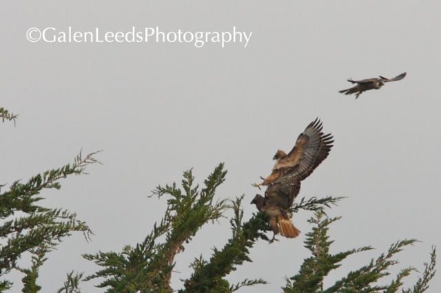 The young falcon circled back around to view the aftermath, of two larger hawks perched on their own branches, separated