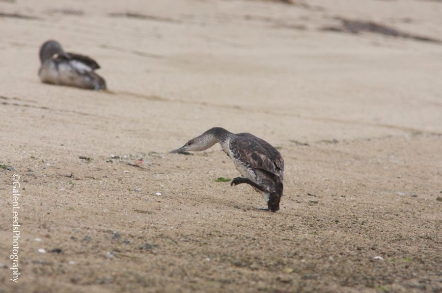 You can see the Yellow-billed Loon has already retreated to the beach, and is laying there in the background