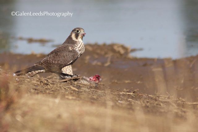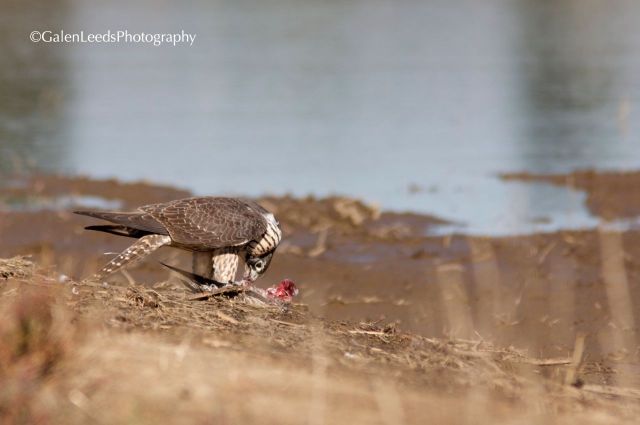 I had beached my kayak and crawled through marsh plants and grasses to where I had a good vantage of the falcon eating its late breakfast, while remaining mostly hidden by the sparse vegetation of the wetlands, and a small rise.The peregrine was sitting in the open, so was constantly looking around for predators or other raptors looking to steal its kill.