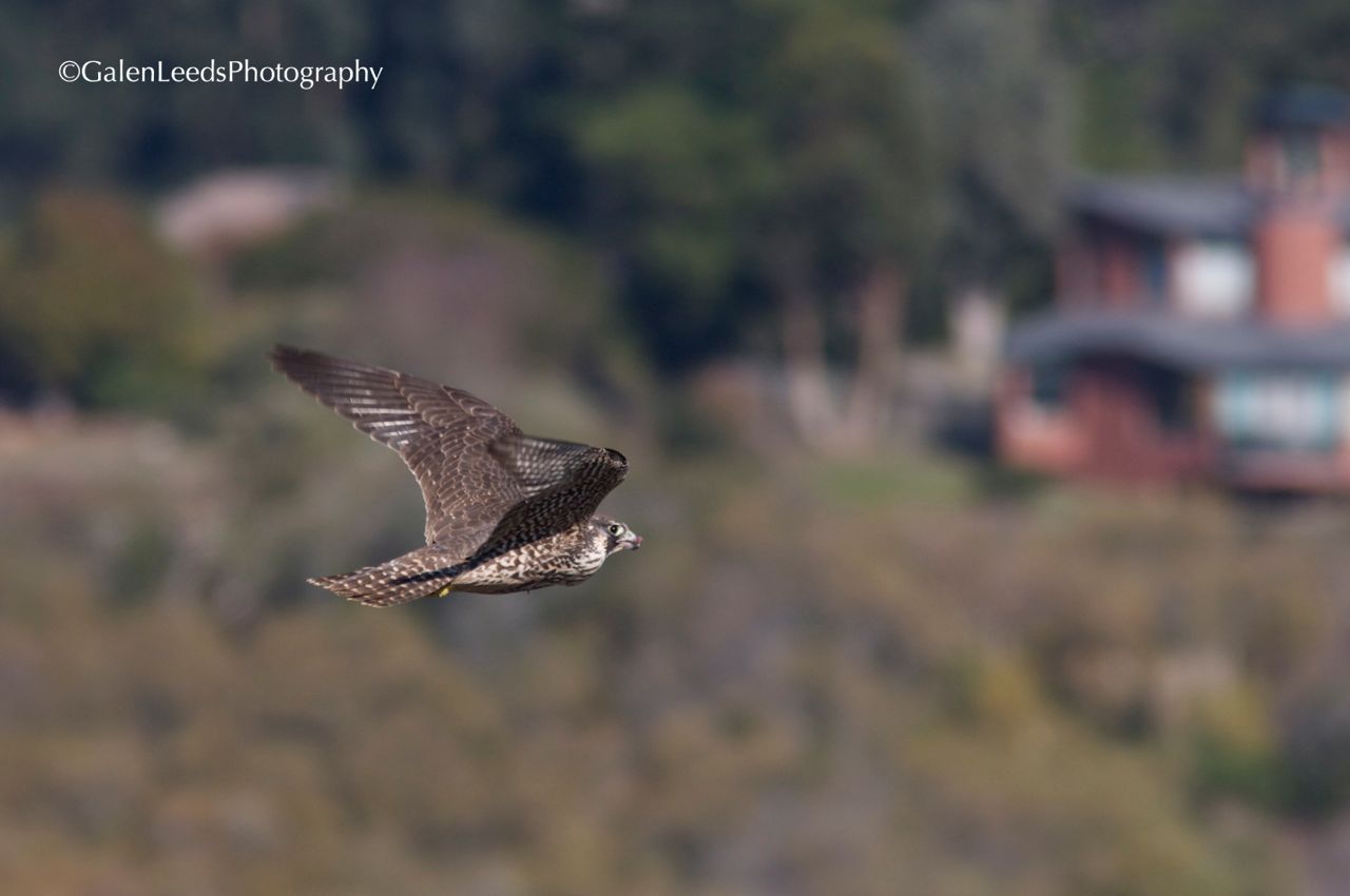 Giacomini Wetlands, Juvenile Peregrine Falcon (Tundrius) flying through the wetlands with a full crop