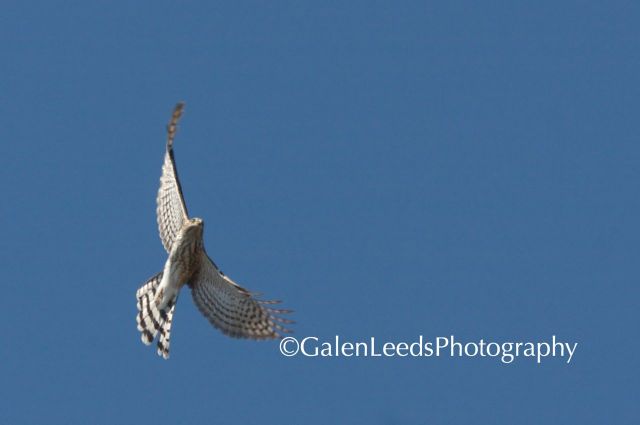 When photographing birds from underneath, especially if they are at a slight distance, your camera often will not set to the proper exposure. All of that sky in the image can confuse it, and depending on how bright or dark the sky is, you will have to adjust your exposure. I find that to capture detail in the bird, I often have to over expose the image by about 2/3 stop. Sometimes this will leave the sky a little washed out.