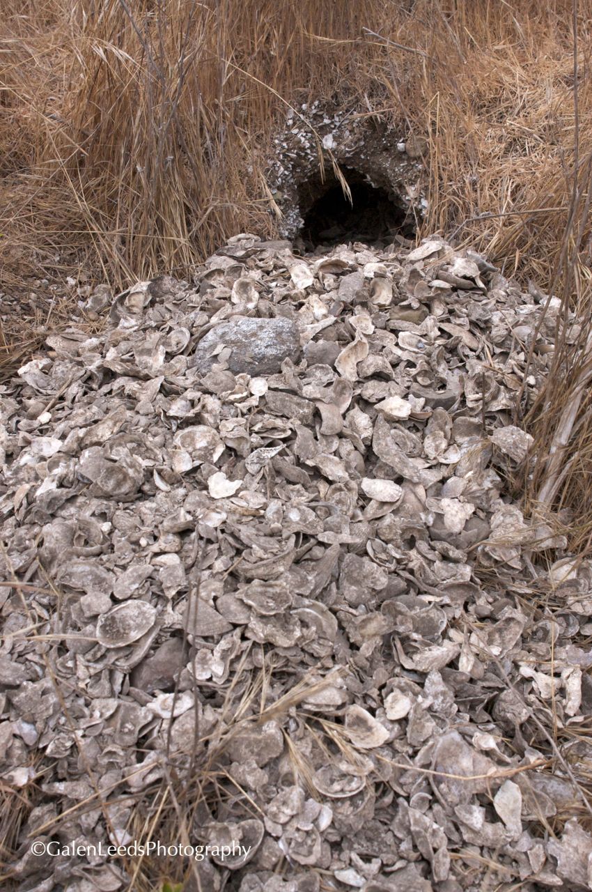 Oyster shells scattered at the entrance of a badgers burrow that was dug into a midden pile from decades or centuries before