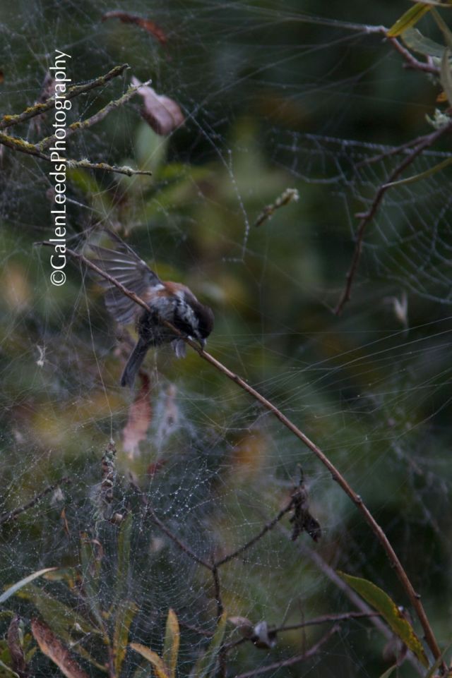 One day while kayaking with a friend, I saw something I never imagined to see. A Chestnut-backed Chickadee with its wind stuck in a spider’s web. There were actually many of these thick spiderwebs around, and several chickadees, but only one that I saw with its wing enmeshed in a web. I took some photographs from my kayak before beaching on the shore to try and free the poor thing, but it was a ways back in some very thick trees.