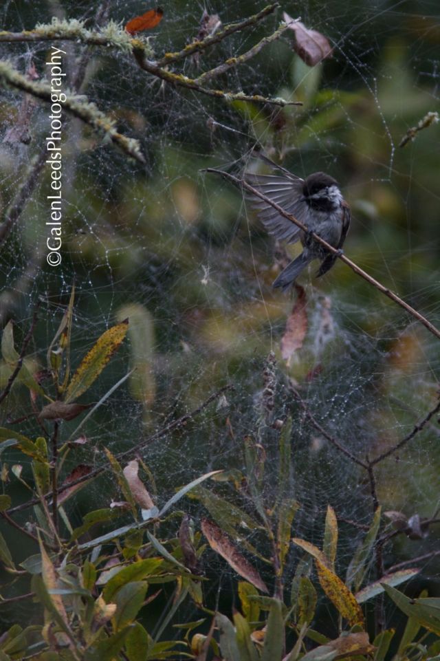 Massive webs! Even though I sometimes let nature take its course and not interfere, I would have responded by going to the rescue too.I just love chickadees. Good that it got away on it’s own. Ha! Maybe it thought you were the spider coming for the meal and gave one huge effort to get away.Nice to see your posts again, Galen.