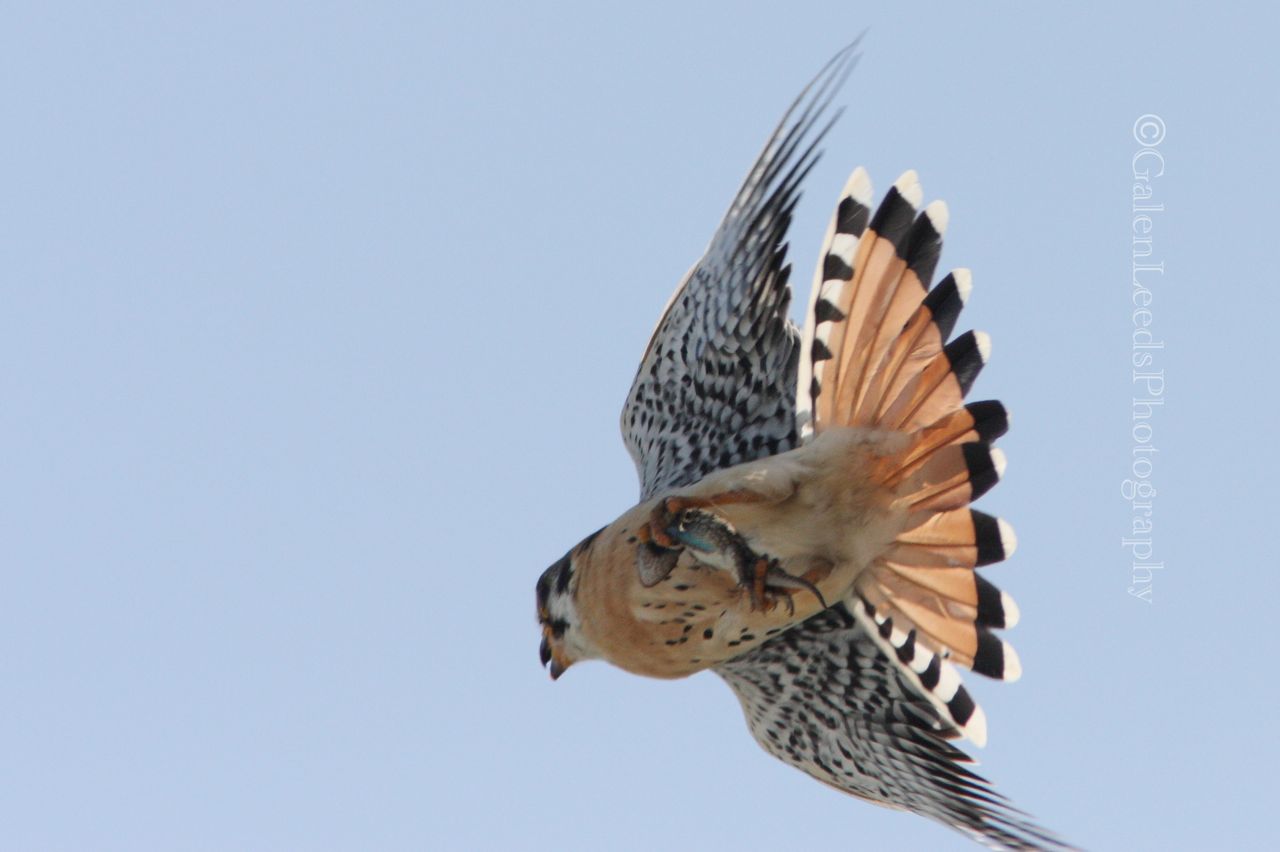 I’m very happy to have gotten this male kestrel carrying a lizard, but that wing tip out of frame will forever bother me