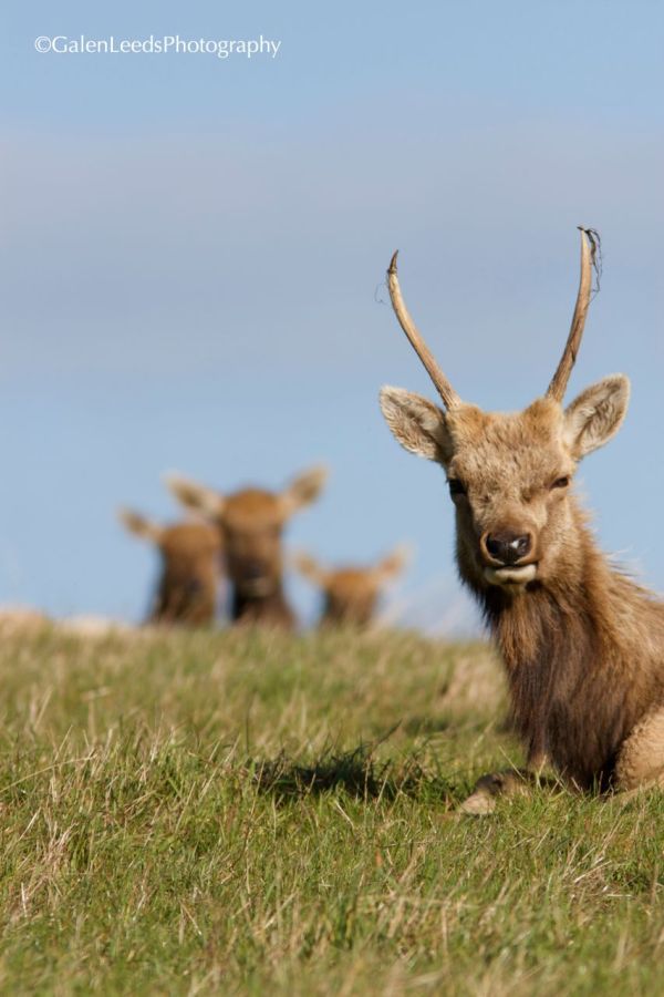 Young bull elk with velvet peeling from its antlers and females watching from behind
